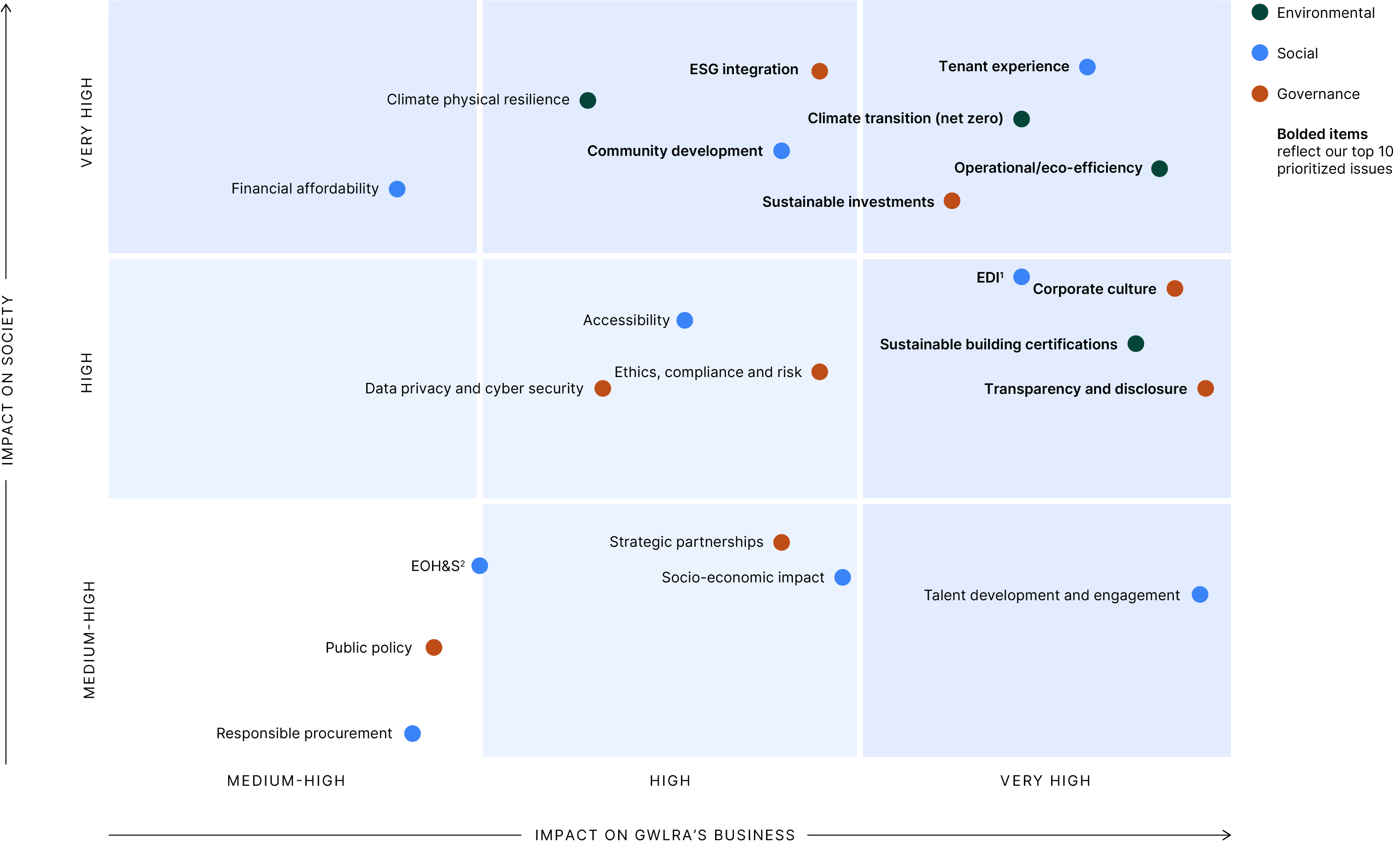 We reflected our prioritized topics on a matrix, highlighting their relative positioning as it relates to the impact on our business and the impact on society. These topics were mapped to our five strategic pillars, which support and are aligned with our strategic business objectives and priorities.